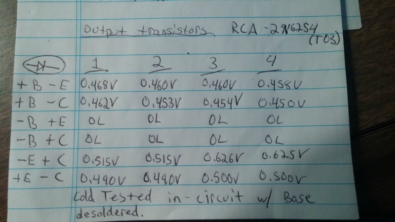 My research leads me next to attempt to test the output transformers, which by my estimation are those 4 little guys at the bottom of the picture in the TO3 package. My limited experience in diagnosing/trouble shooting has led me to test them this way : I tested them on the diode test function on my DMM with the base desoldered from the circuit but the other 2 leads still in circuit. Don't remember where I read it, but somewhere I read that I could test them this way. I got these values which I believe read out as expected :