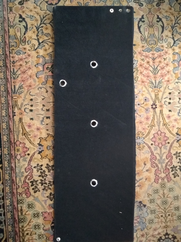 While the bottom of the frame was adhering to the tolex, I glued the carpet to the top of the board, placed gromets in the additional holes (that I apparently never documented drilling) that allow power cables and MIDI cables to travel between the top of the board and the area underneath, and affixed the power supplies to the underside (which I would later temporarily remove to spray paint this part of the board).