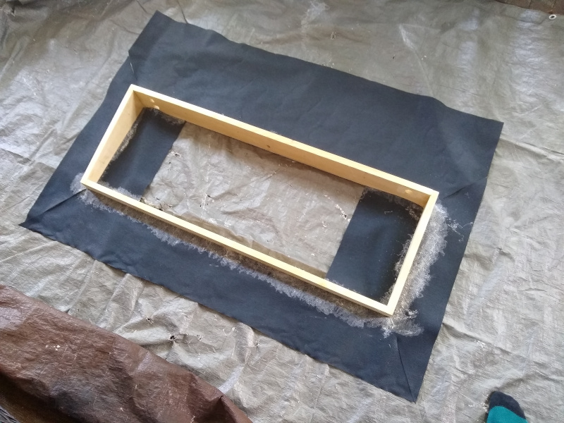 Next I wood-filled and sanded the shit out of everything to try to get it as smooth and uniform as possible before applying the tolex, which I decided to do as one piece, a good decision which I Implemented poorly. First I glued the bottom of the frame to the tolex, so it would rest firm for cutting to fit. This was the biggest mistake of the project, as I should have glued it to the top to keep my seams underneath the board. Oh well.