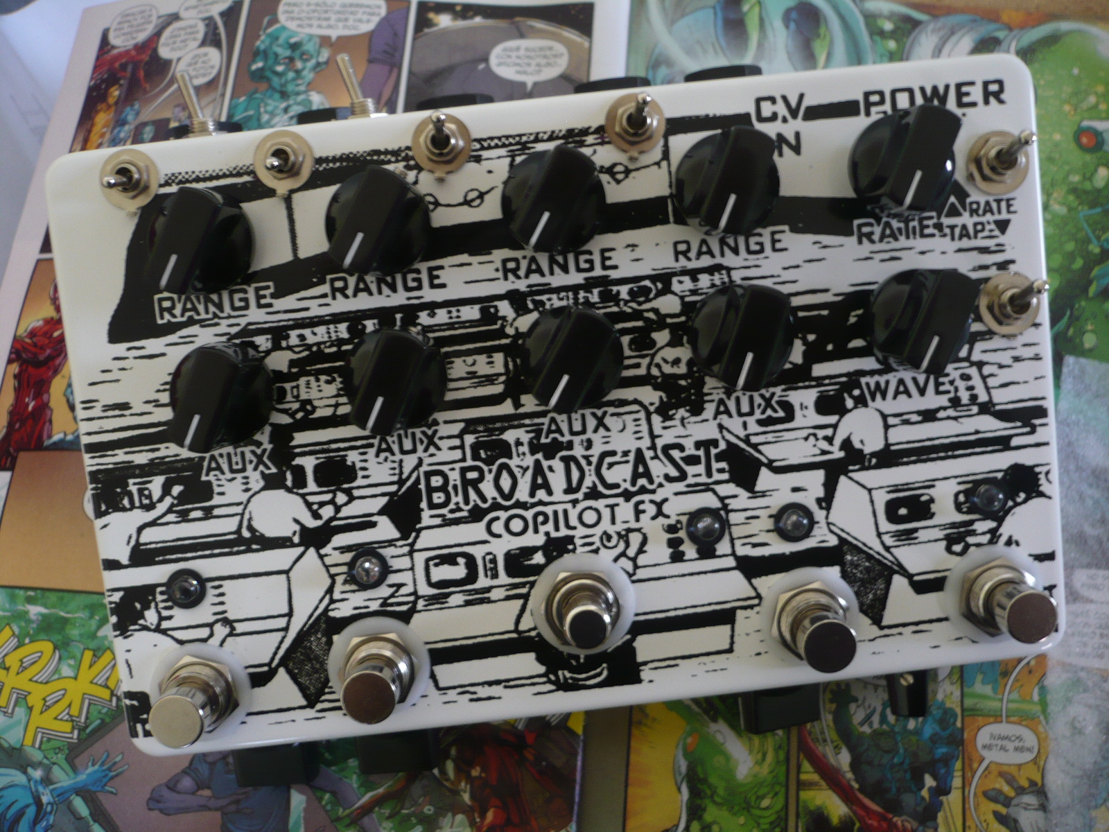 Quad Broadcast: 4 independent outs, footswitch to select from LFO or external expression/cv input or fixed (knobs on the bottom side) for each out, rate/tap ratios can be synced to the expression / cv in, and tap or rate switch. The last 2 channel have a phase invertion, so they flip the direction