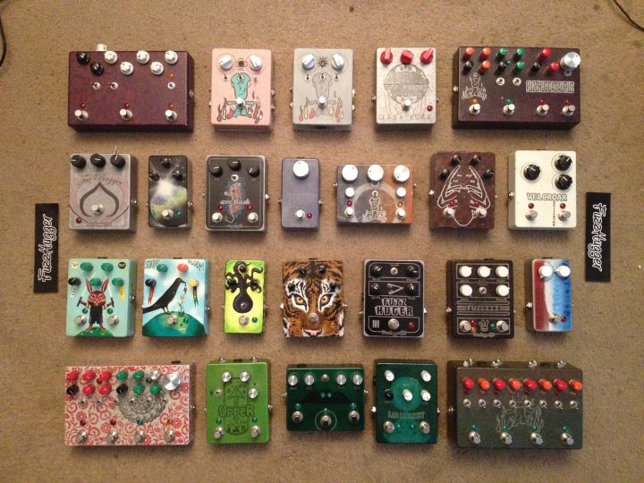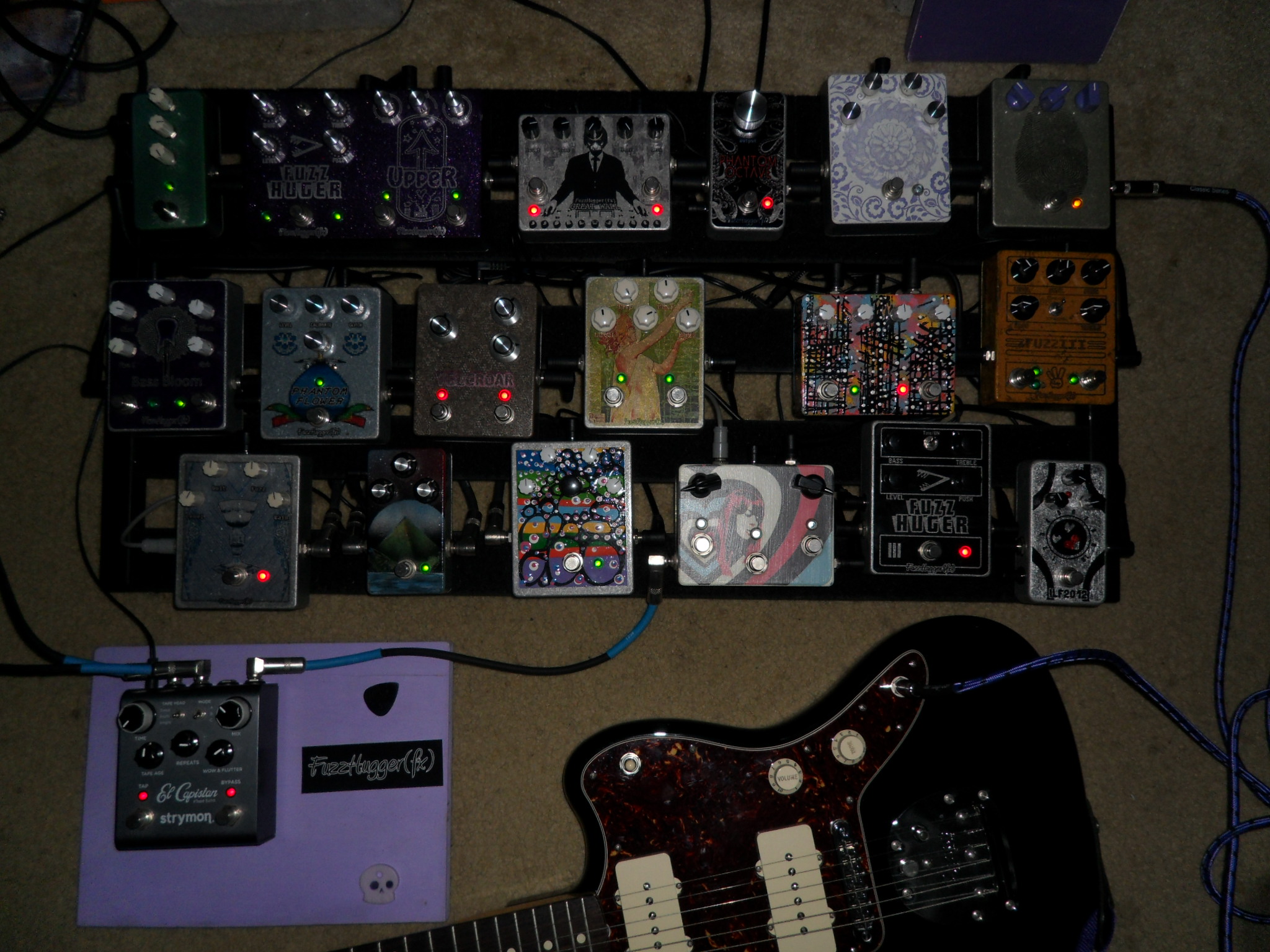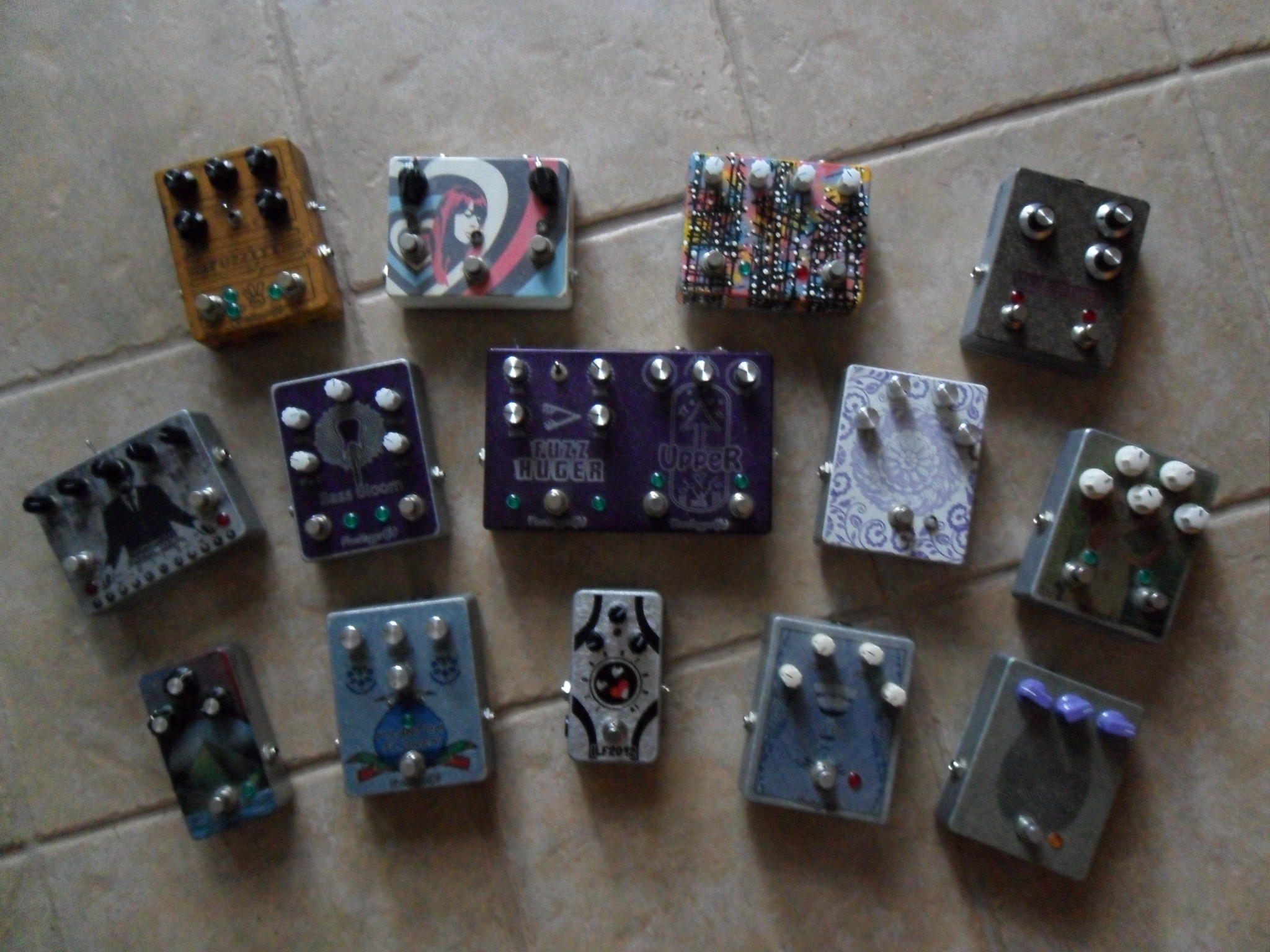 third row... ab-synth 5k, algal bloom, dark boost, wolf computer, fuzz huger, FUZZIII, velcoroar