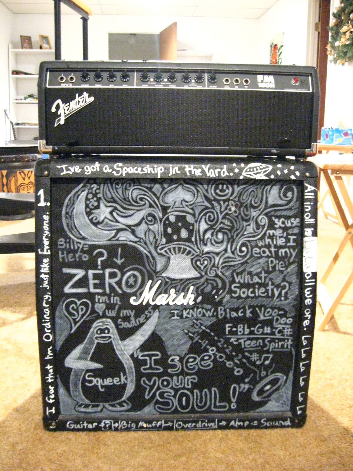 Fender FM100 into a MG cab (yes I have owned an MG100 head )- I'm using my other amp more now but this beast has survived many gigs.... and many guitars being thrown at it. Artwork done by myself.