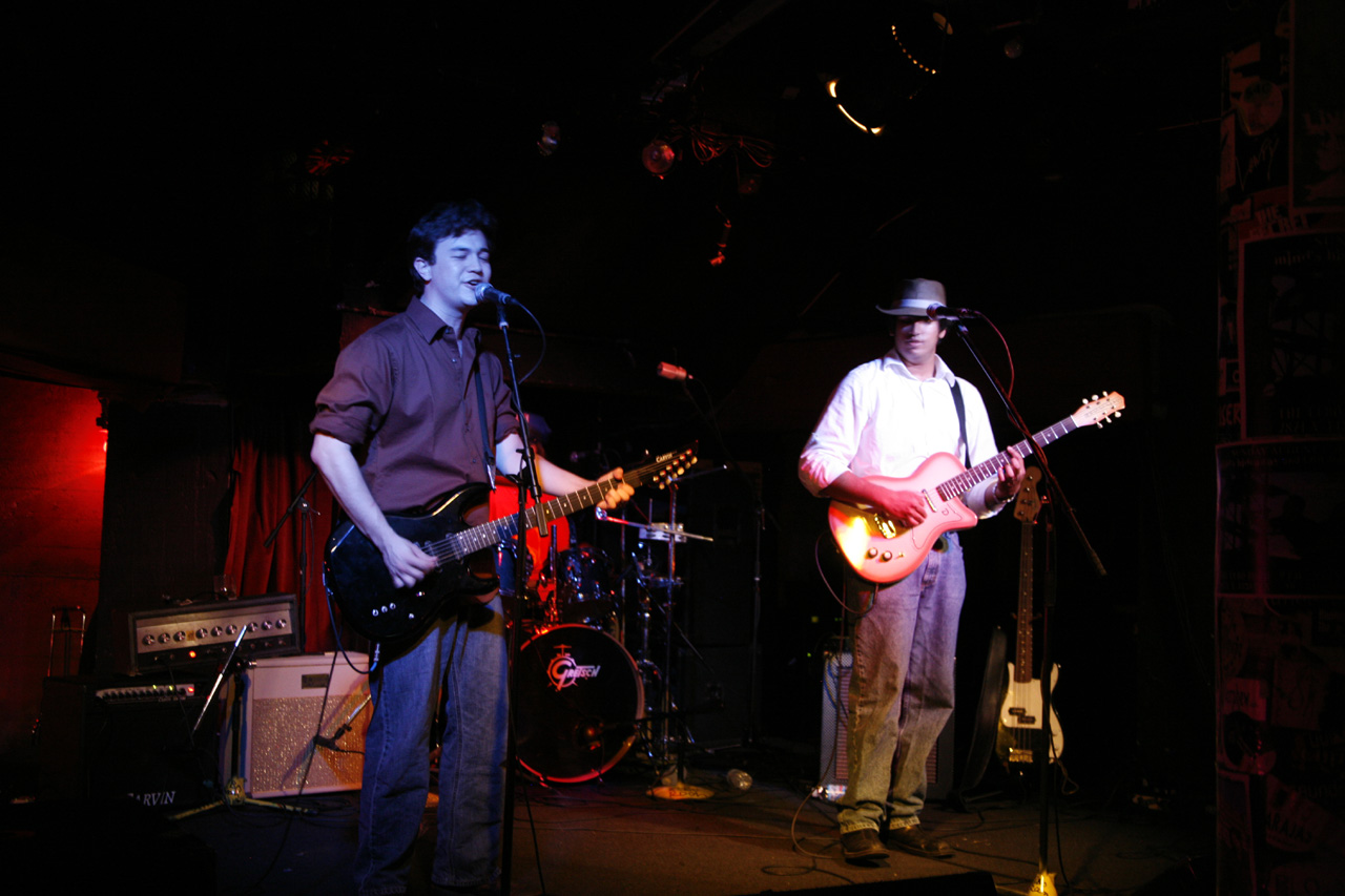 And to the right: bassist moonlighting on guitar, with a hat borrowed from the opening act just for the one song.