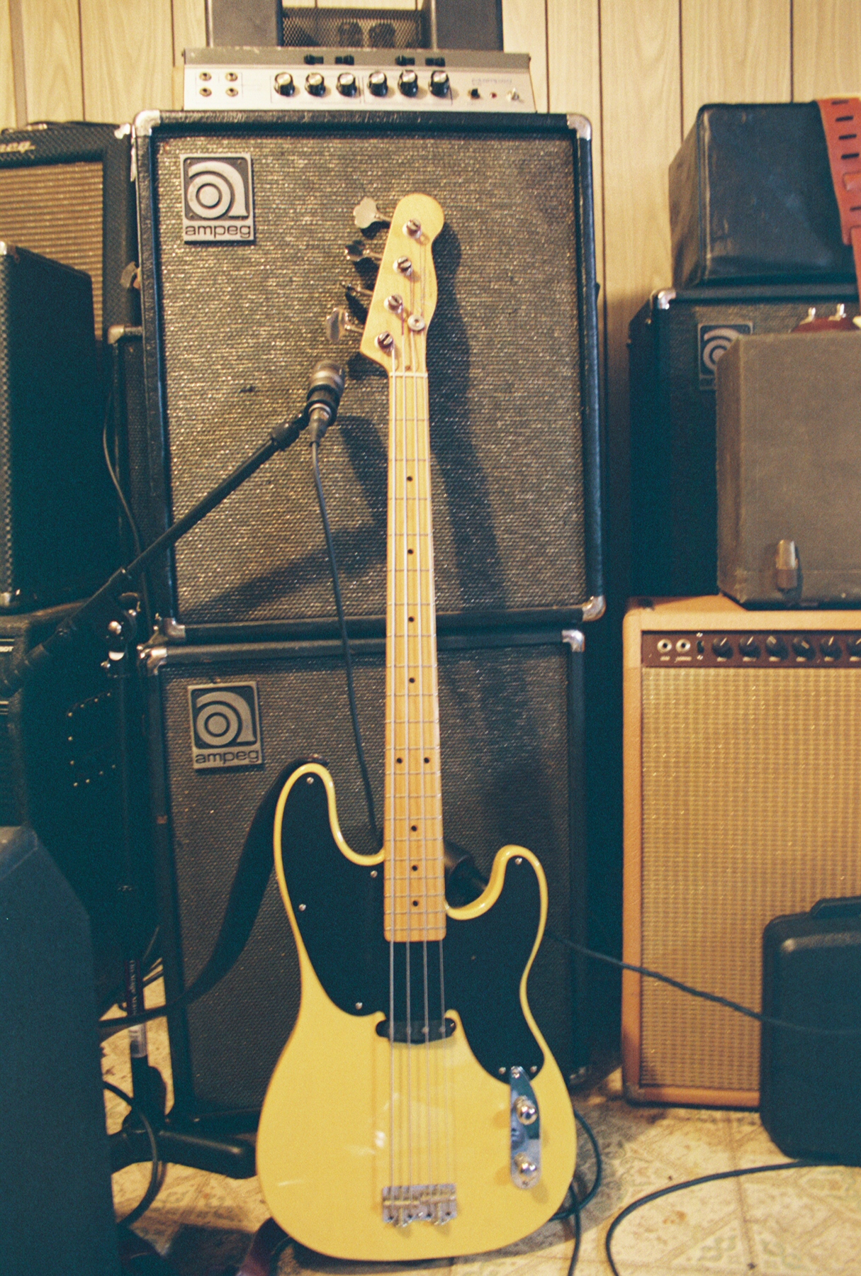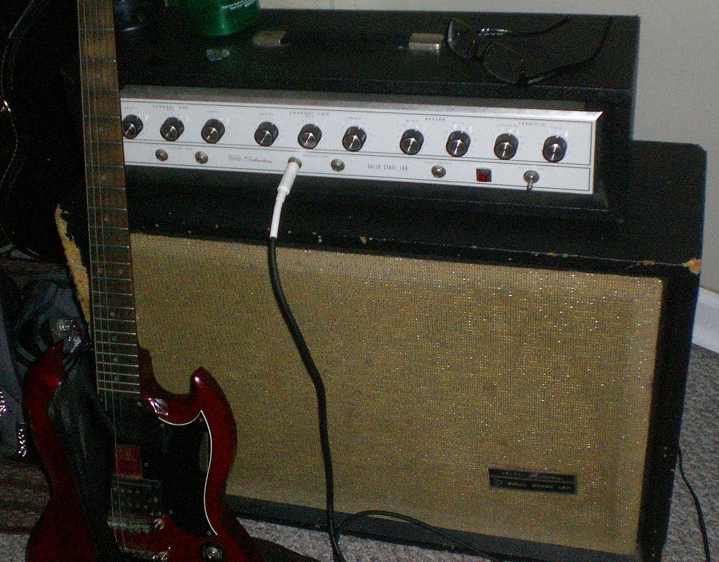 I rock a Silvertone 1484 head with a J Design 1x12 loaded with a Weber ceramic Blue Dog. Recently I've been running stereo with a Carvin SX100 combo for a little more clean headroom. You can see it precariously balanced behind me.