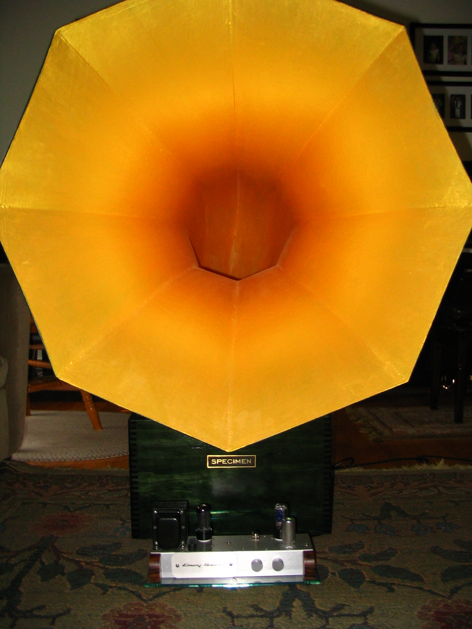 BBE Bmax Preamp w/ Carvin poweramp (putting out 500 watts. I had it bridged to 1500, but it wasn't any louder...). Avatar Neo 4x10 cab. The Horn's been removed and I sealed it with a 2x4 and latex caulk. w00h!
