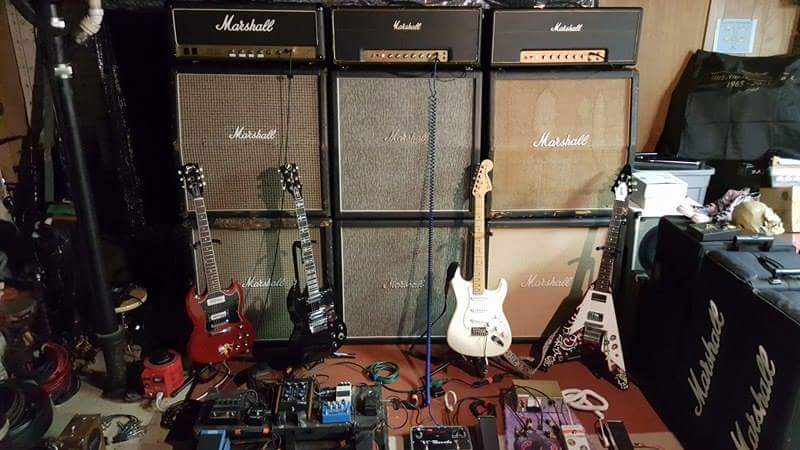 ADA 2x12 "split stack" with matching rat-hair ADA 4x10. Carvin DCM 1204, with channels 1 and 4 feeding the guitar cabs and ch 2/3 bridged into the bass cab. Aria stereo real spring reverb into ART stereo tube 4-band parametric EQ. Top rack is the bass simulation station a.k.a. "Drunk Bassist" and includes of a crossover sending lows to a Sonuus G2M midi converter and then midi to an Alesis bass synth module. Mids go to a pitch shifter set at 2 octaves down so the higher guitar notes go lower, keeping it in the bass range. Both synth and pitched signals go into a mini mixer and then to an ART preamp which sends to the power amp and bass cab.