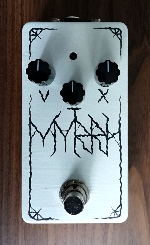 Enclosure is a 1590B, had these enclosed jacks that seemed like a good fit, and they were. Of course I had to shave off some plastic and also grind down the lip on the bottom plate to make them fit, but other than that no major struggles. LED is red. Hand painted everything (except for the spray primer+matte clear coat). Named after everyone's favorite embalming aid. Surprisingly there isn't a black metal band called MYRRH, though there should be.