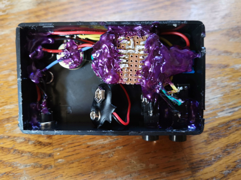 On it's own, it's slightly boring (the most trebly settings have some glitchy movement which is cool) but it's more fun being fed into other pedals as a source or part of the signal chain. Then pedals downstream get more interesting and can be somewhat unpredictable. A drone loop fed into the input works pretty well, with (for example) a Stomping Stones Bit Crusher and Death Metal downstream, then playing with the Unknown Glitch's knobs and light sensor. Even with the Volume all the way down, downstream pedals react to it. There's a certain amount of latency, a one second lag between action and result sometimes. It seems like maybe the photo eye controls a voltage starve? I'm not sure.