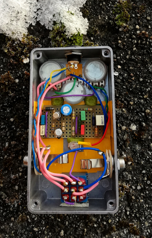 Here's my second Ghost Lunar Incantation clone. Same as the first in that there are no mods but the vero was initially meant for another fuzz (FY-2 in this case) and then I changed my mind. So the circuit layout is a little different and it's in a smaller enclosure. Also it has an ST BC108 as Q1 and a CDIL as Q2, whereas the first had two CDILs. Haven't compared them directly yet but probably not wildly different. One of them might replace the fuzz face currently first in my chain.