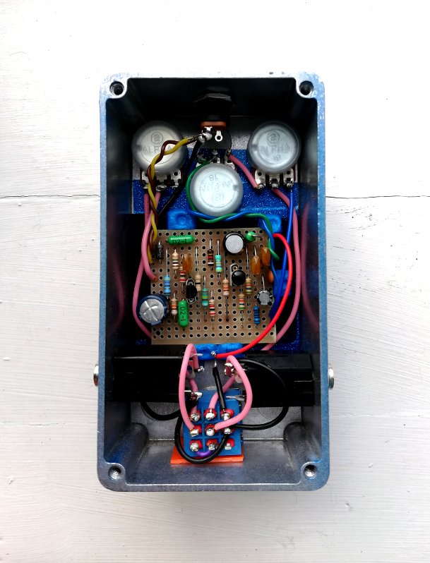 This dual Schaller tremolo here turned out a little strange visually, I guess it's the closest I'll ever get to a patriotic pedal, with the red, white and blue. Wish I had mirrored the knobs maybe, but overall I'm happy with the layout and ease of use. Only small mods I did was add a 1.2m pulldown resistor, slightly increased input impedance (why?) and a switch on each of the depths to lift the ground, thus cutting out the valley of the wave for a hard-chopped albeit quieter trem. Not a brilliant mod as the Schaller is choppy (chopper-y even) enough already. Volume drop doesn't seem too bad. Transistors are BC170 with a BC109C at the end. Middle switch is for the trem 1 speed range, which probably should generally be set to fast because in slow mode the last 10-20% of the speed pot flattens out the wave and you just get volume reduction, esp with depth set high. That's the only obvious flaw so far, or well the range/smoothness of the speed/depth pots is not perfect, should have selected them more carefully maybe. Does what it's supposed to tho, which is being two asynchronous tremolos in one box to run both sides of my stereo signal thru.