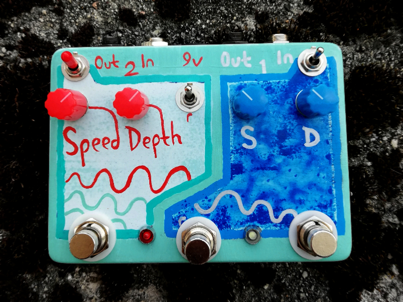 This dual Schaller tremolo here turned out a little strange visually, I guess it's the closest I'll ever get to a patriotic pedal, with the red, white and blue. Wish I had mirrored the knobs maybe, but overall I'm happy with the layout and ease of use. Only small mods I did was add a 1.2m pulldown resistor, slightly increased input impedance (why?) and a switch on each of the depths to lift the ground, thus cutting out the valley of the wave for a hard-chopped albeit quieter trem. Not a brilliant mod as the Schaller is choppy (chopper-y even) enough already. Volume drop doesn't seem too bad. Transistors are BC170 with a BC109C at the end. Middle switch is for the trem 1 speed range, which probably should generally be set to fast because in slow mode the last 10-20% of the speed pot flattens out the wave and you just get volume reduction, esp with depth set high. That's the only obvious flaw so far, or well the range/smoothness of the speed/depth pots is not perfect, should have selected them more carefully maybe. Does what it's supposed to tho, which is being two asynchronous tremolos in one box to run both sides of my stereo signal thru.