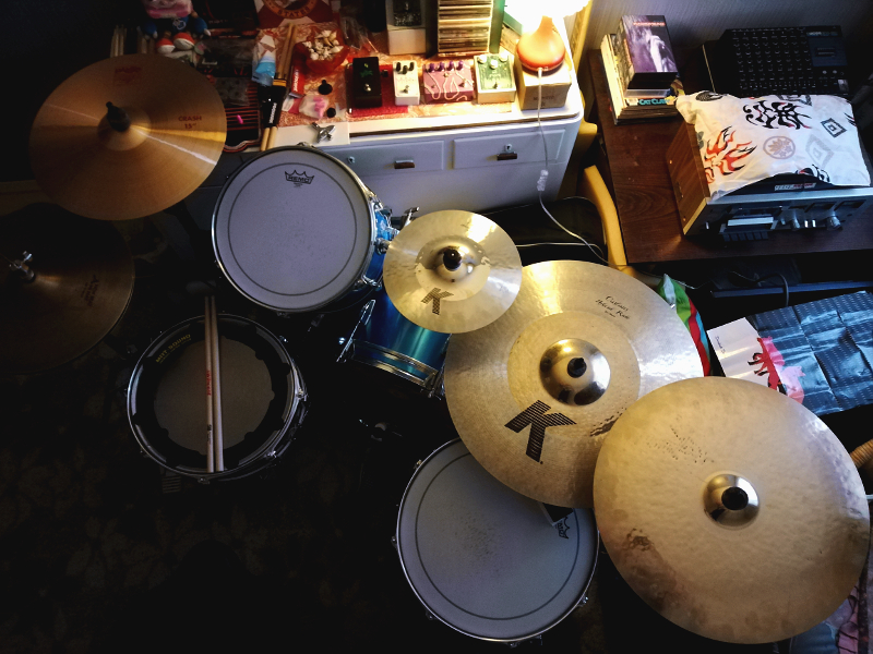 Japanese Tama Swingstar from the '80s - 16" floor tom (left side b/c space), 14" snare, 13" tom. The cymbals are Zildjian 15" New Beat/Quick Beat bottom hat, 17" K Custom Fast Crash, 21" K Custom Hybrid ride.