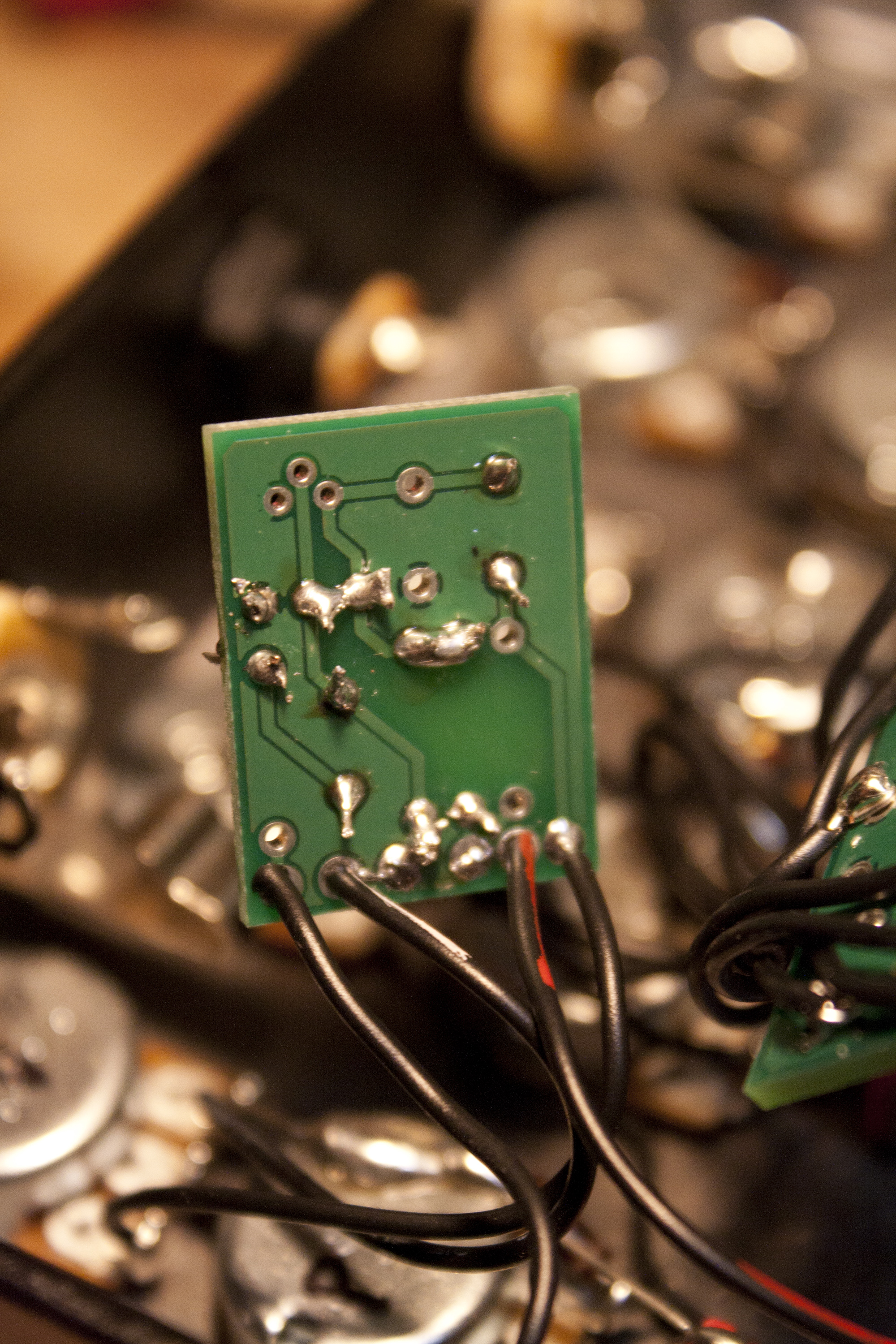 I have images attached of the mess I've created. I wired the input wire to the R1 pad, but it wasn't working so I took it out and wired it to the input... IDK IM NEW, JUST TRYING STUFF. I don't know if its swell to leave solder in the pads... ARE THEY CALLED PADS? Thats what I've come up with by looking at stuff. I need to put a capacitor into C2 for a dark boost, but I left it out for now just to see what happens.