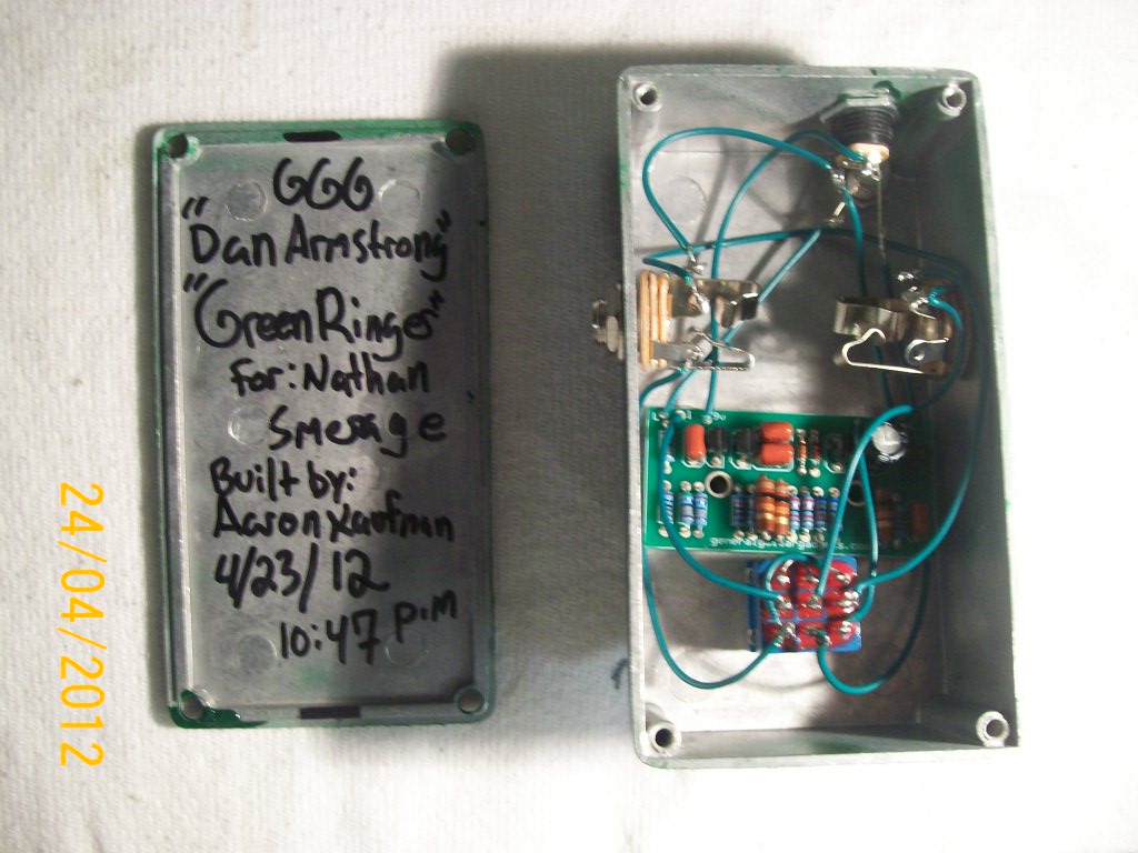 Word, I took it in to my Electronics teacher at school. We figured out that there was a solder bridge on the bottom, too much solder, and it was grounding out one of the transistors. But we fixed it, and it sounds awesome. Typical Octavia type sound when playing oen note at a time, but it gets all ring modish and glitchy when you play three ntoes or more. I'm really glad I finished this build for my friend, truly his patients is the most impressive thing here!
