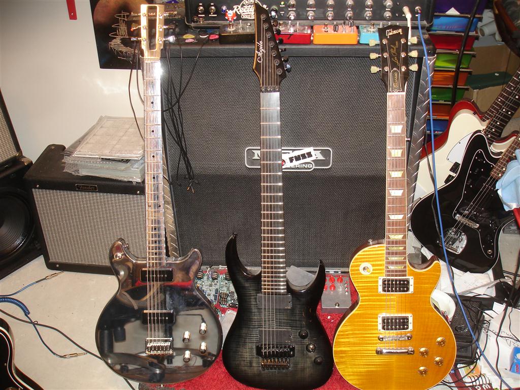 The LP is the easiest to play and has an awesome dark chug to it but it's hard to make it in tune all over the fret board... that works ok for me since I only like the first few frets anyway. The 7 string is hardest to play thanks to its wide neck and too many strings and everything you play on it sounds like Fear Factory, tight and EMG sounding. The EGC is kinda hard to play with its huge frets but it's my favourite sound, very tight and bright.