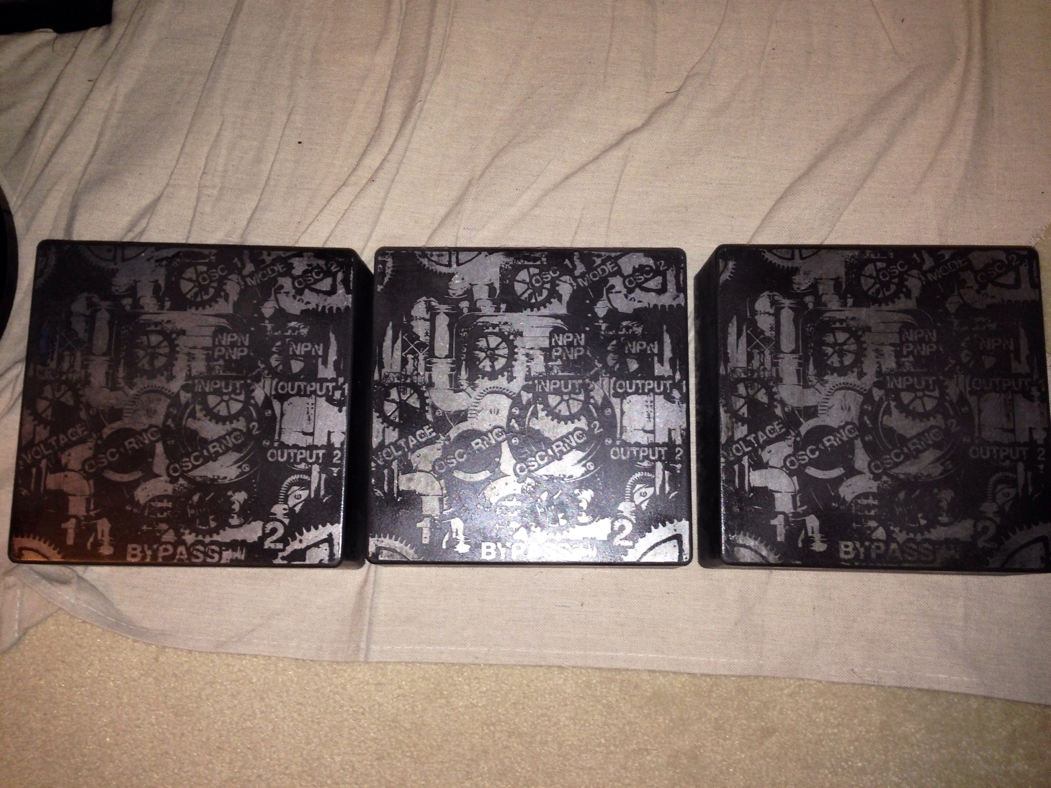So first off, I am doing only a limited run of 5 etched Incinerators at a huge discount exclusive to ILF members! They look insane, sound insane, and I think after this run I will be switching to a smaller and lower priced version. The thing with the Incinerator is that the parts cost a lot, one of the transistors I use in it is rare and there are a few of them in the circuit, and it's a mission to build, so I decided to take away the volt meter, big switches, and possibly the Jewel Pilot LED's. it will be at a lower cost with all the same sounds and will still look great I will of course offer the big one in the future if someone wants it badly, but will cost the original price and will be the original black.