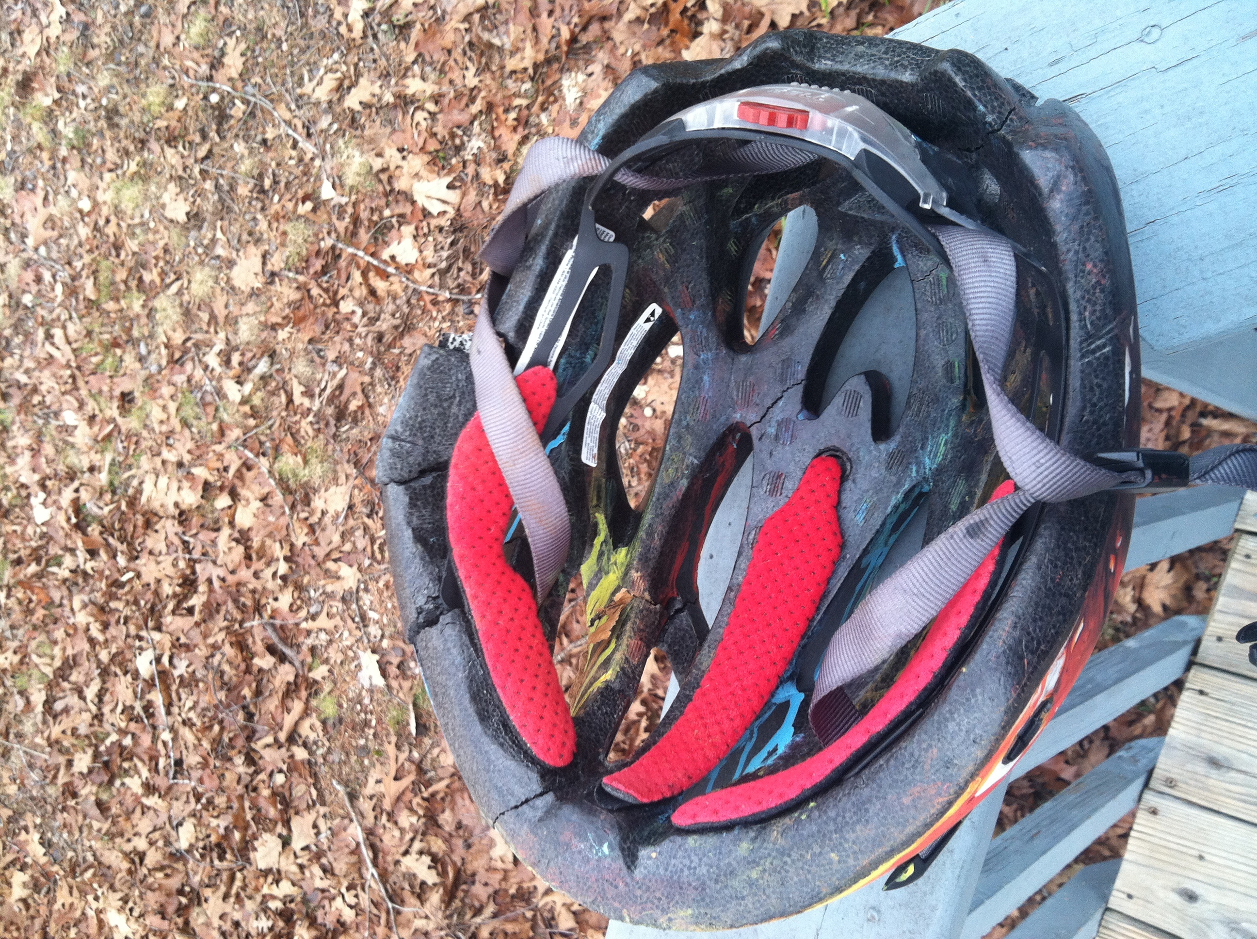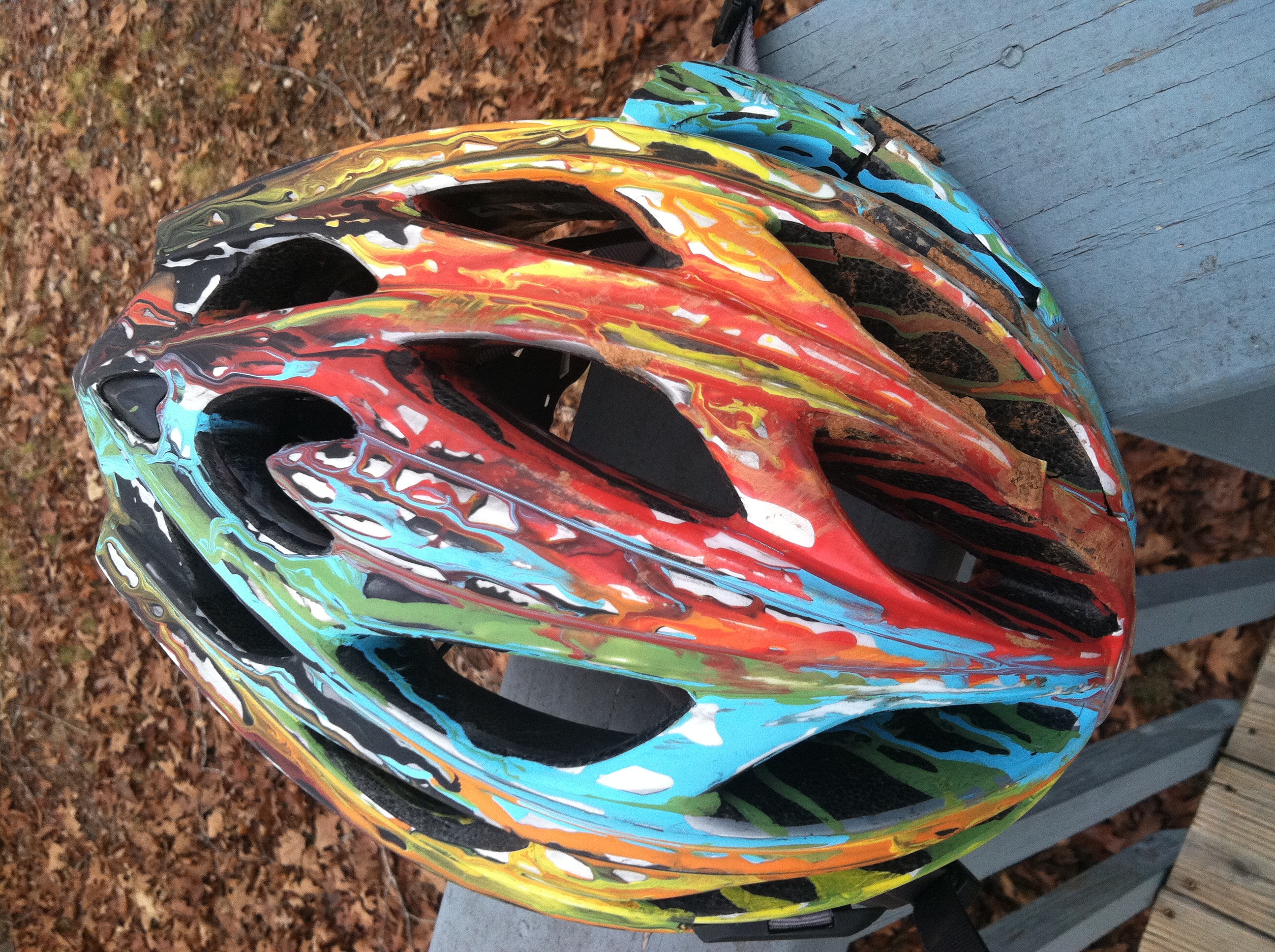 I got a new 'special ed' helmet... Way better than that specialized brand! No more black eyes or traumatic brain injuries for me I hope. Also some pics of my old helmet that I painted and crashed hard in... Fully shattered with thirteen cracks but the thing saved my life.
