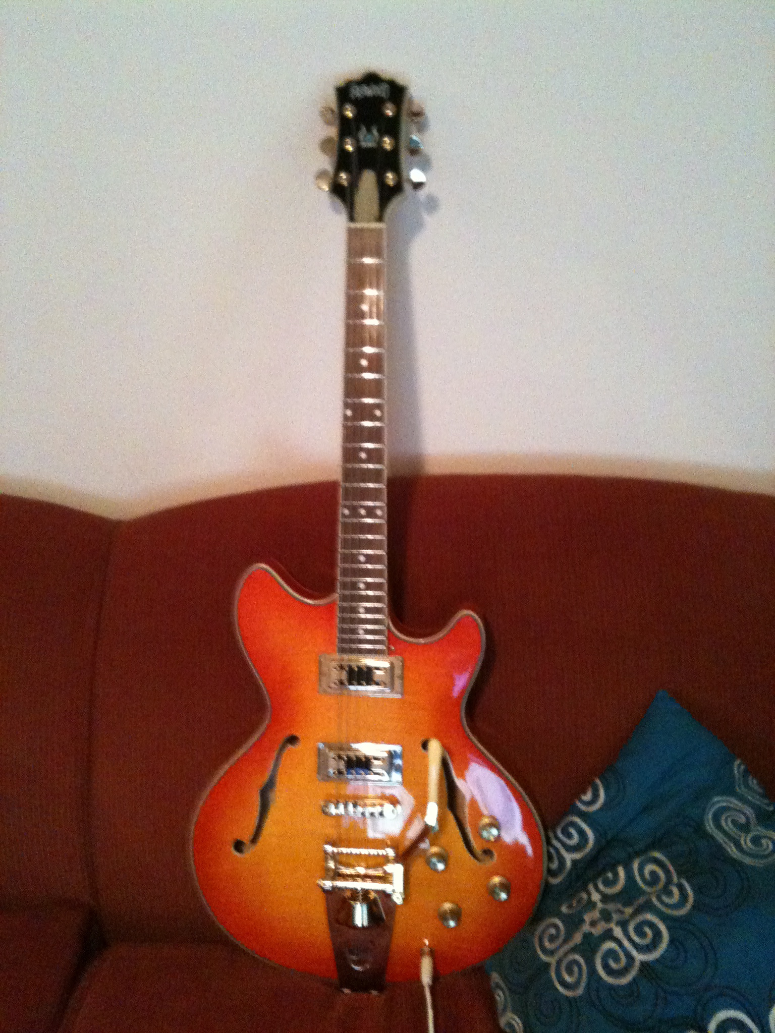 So I got a Gretsch "Beast" the other day and damn what a beast it was. That guitar said fuck clean tones! The pickups are so hot I couldn't get anything else out of it I just don't like the idea of having a one trick pony guitar so after two hours of having it I took it to Austin Vintage Guitars where they had a few semi-hollows which is what I was basically looking for in the first place but craigslist wasn't delivering. I've been wanting a Epi Sheraton 2 for a while and they did have one but this beauty was right next to it stealing all of it's glory. I ended up trading the Beast for this guitar and what a guitar it is. I'm so in love with it. These Eastwood guitars are built so well and sound so amazing. It's the first Eastwood I've ever played and it will not be the last one. I've got my eyes on a few others online and I can say with full confidence these guitars are the shit!!! So if you see any of these at a store and give them a play, I promise you will do this :omg: