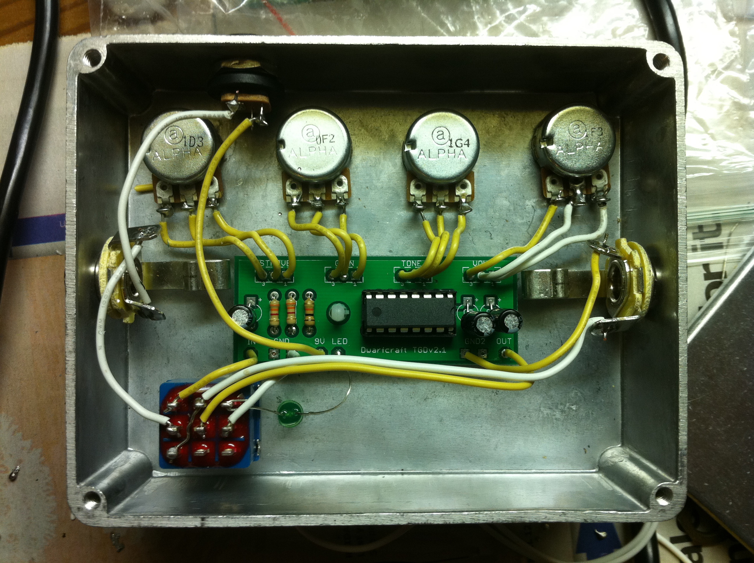 MEC wrote:johnnie1616 wrote:Sorry it took so long for pics, I couldn't find my camera. I don't have a resitor on the LED but it's working fine now(I had it wired the wrong way around the first time). I also swapped one of the connecting wires to a pot because it was to short. I am pretty convinced it is a bad wiring job on my part but I don't really know how to isolate exactly where the problem is. It sonds like something isn't grounded right to me because when I touch the components and the side of the enclosure the crazy unwanted stuff goes away. But I don't know anything about how pedals work so I could be way off base.