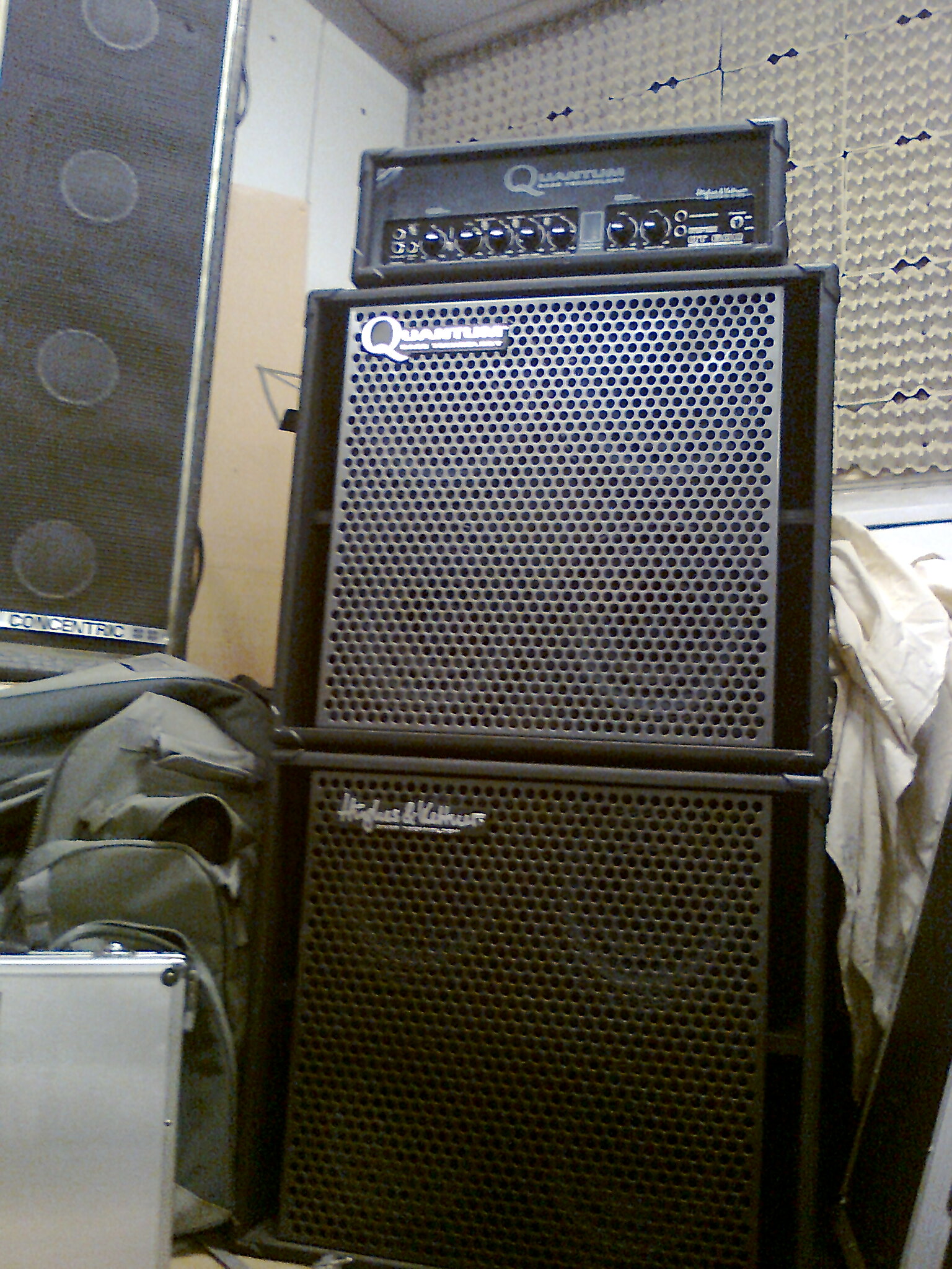 a bad picture of the tower of power. Hughes & Kettner Quantum 600w with two 410's and a send from the amps post EQ DI to the mixing/recording concole.