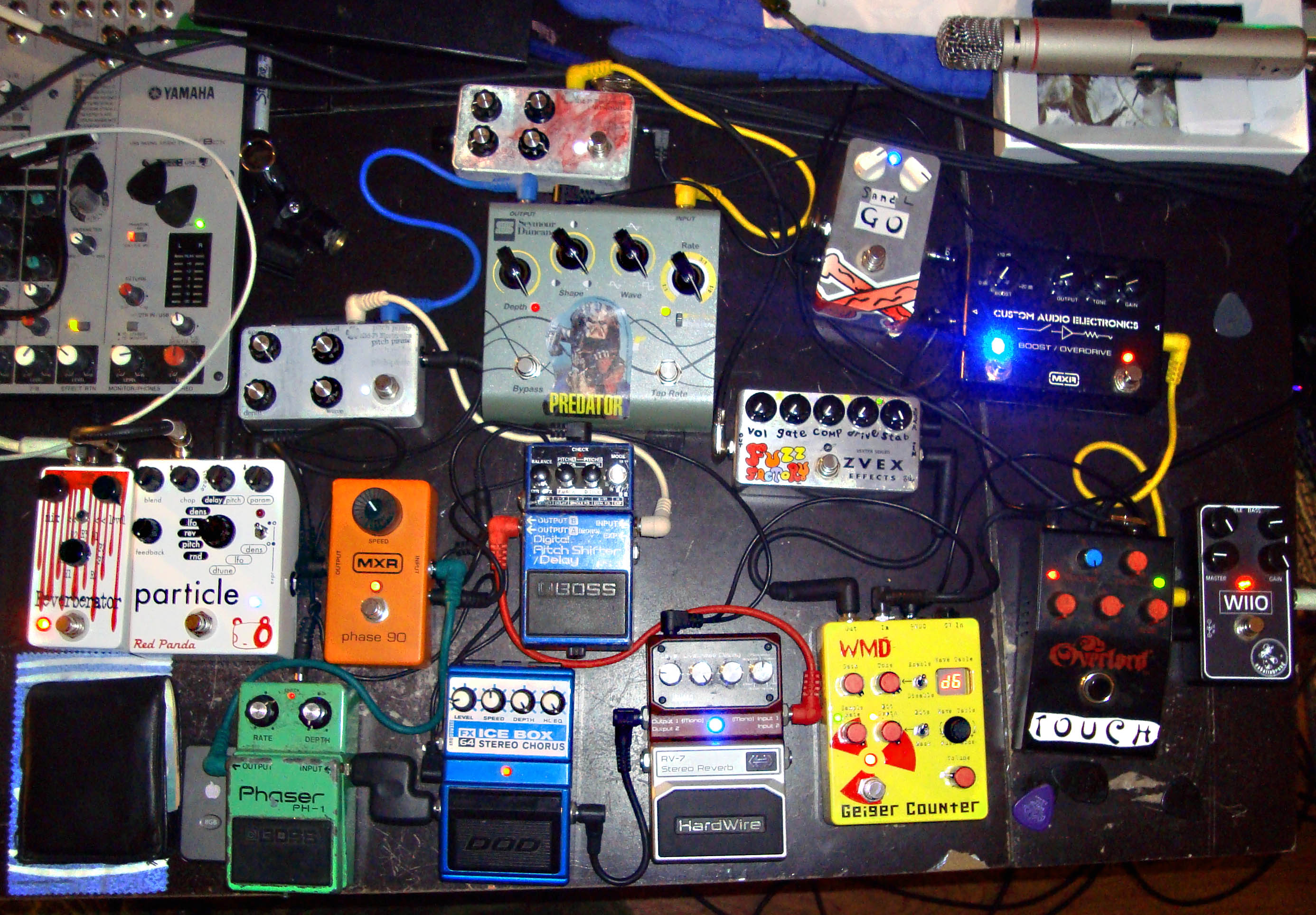 Devi Ever Ruby>Green Russian Big Muff>Devi Ever Soda Meiser>Devi Ever US>Fuzzhugger FX AB-Synth (5K with top-mounted jacks and a Laura Bennett paint job)>Freakshow FX HiRay>Biyang Baby Boom Tri-Reverb>Boss CH-1