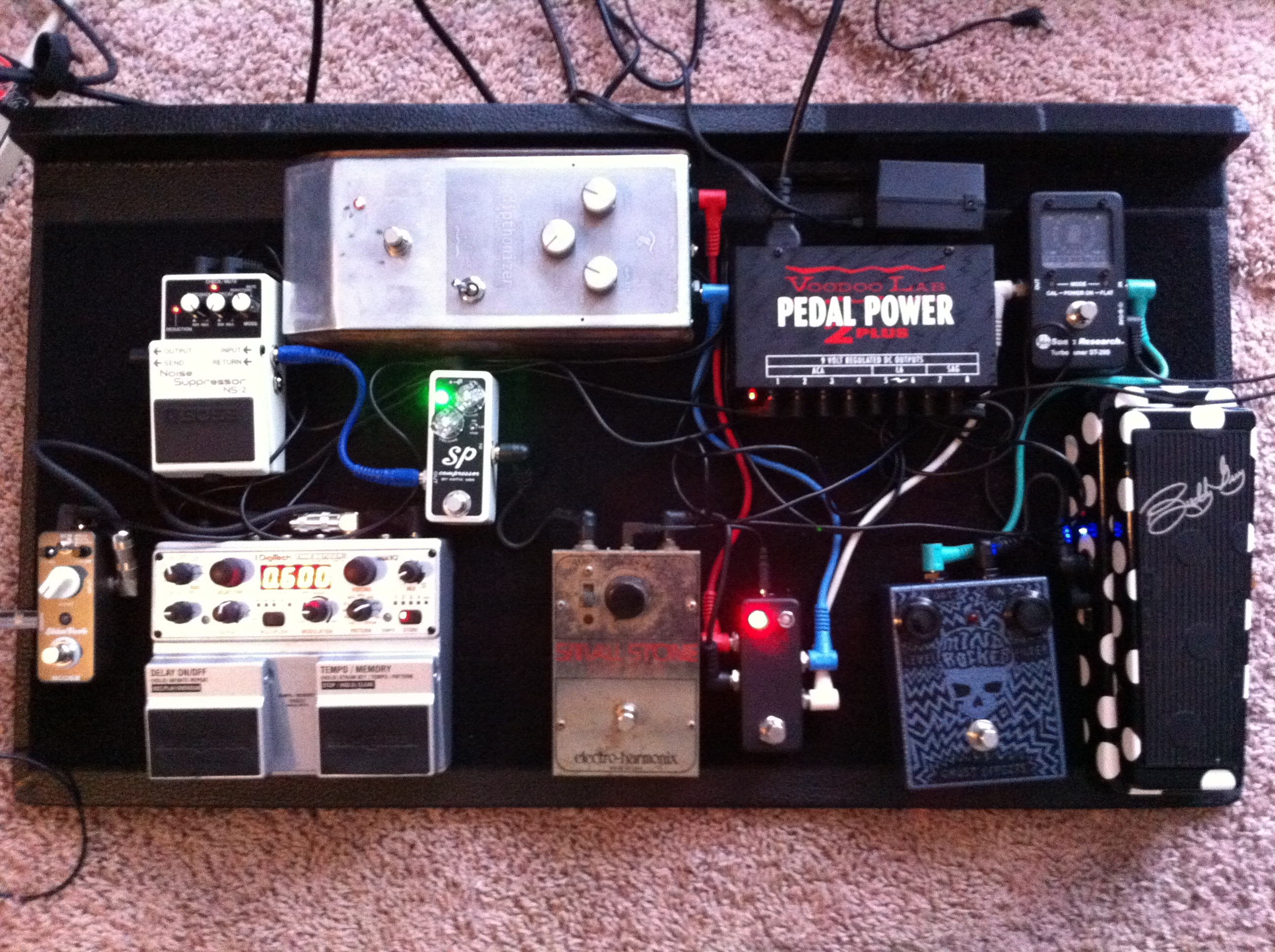 ModTone Chromatic Tuner Sunmachine Reptile Fuzz ( a darker sounding Fuzz Face - I use it as a boost ) Behringer SF300 SuperFuzz ( Boss FZ-2 Clone, used on Electric Wizard's Come My Fanatics & Dopethrone - I use it to have this tone, or as a boost ) Sunmachine Colossus ( 3 Channels Pedal w/ D*A*M Sonic Titan Clone + Sunn Model T Preamp schematic + " Fuzz O))) " - Sunn O)))'s tone ) EHX Metal Muff Sunmachine Götterdämmerung ( " Germanium Fuzz Monster " )