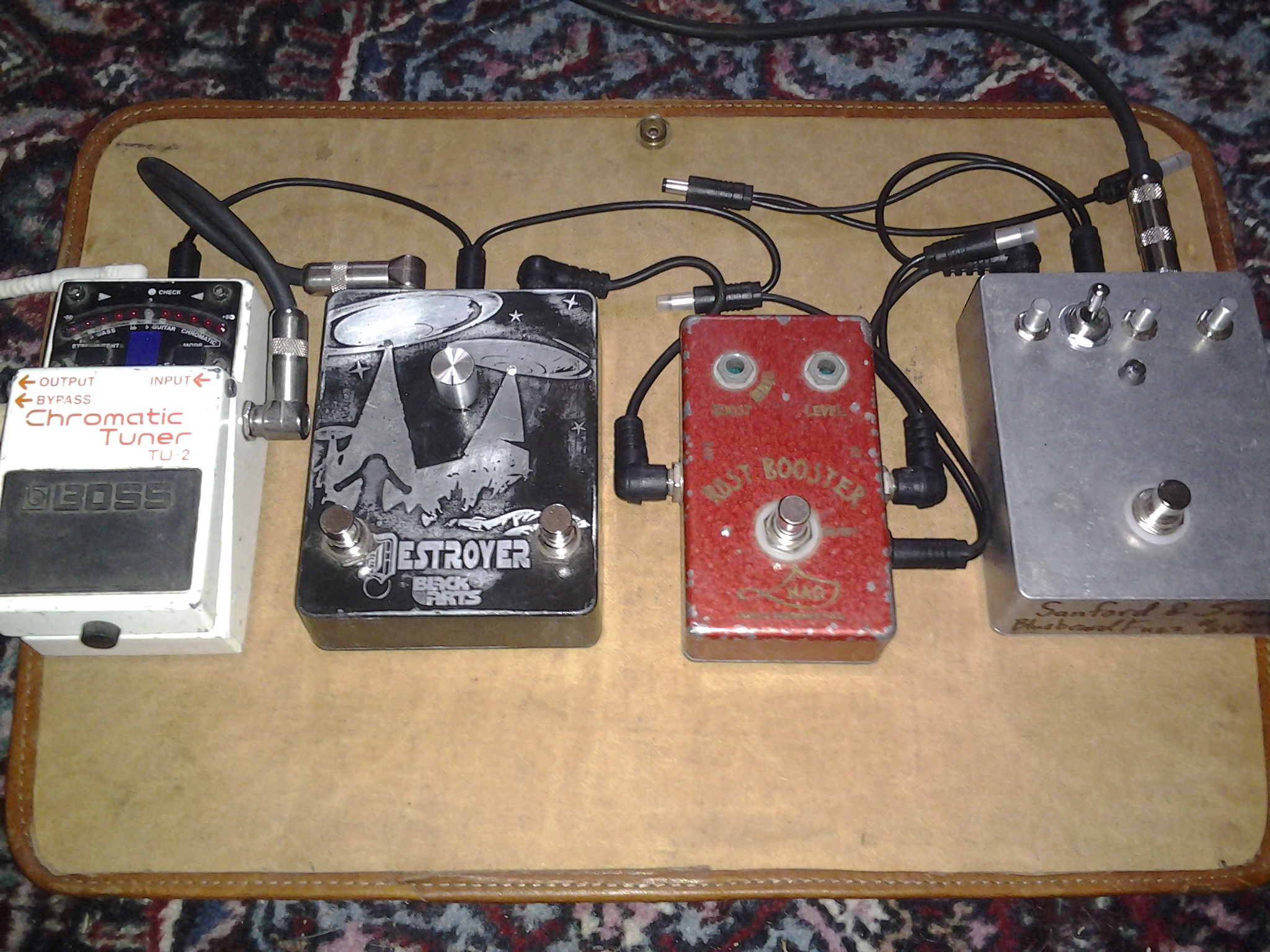 my bass board: bluebeard for scooped fuzz, rustbooster for mids dirt, ritual side of the destroyer if i'm running into the svt, for huge explosions. the acoustic 370's don't handle it quite as well. and the tuner for it's two outputs.