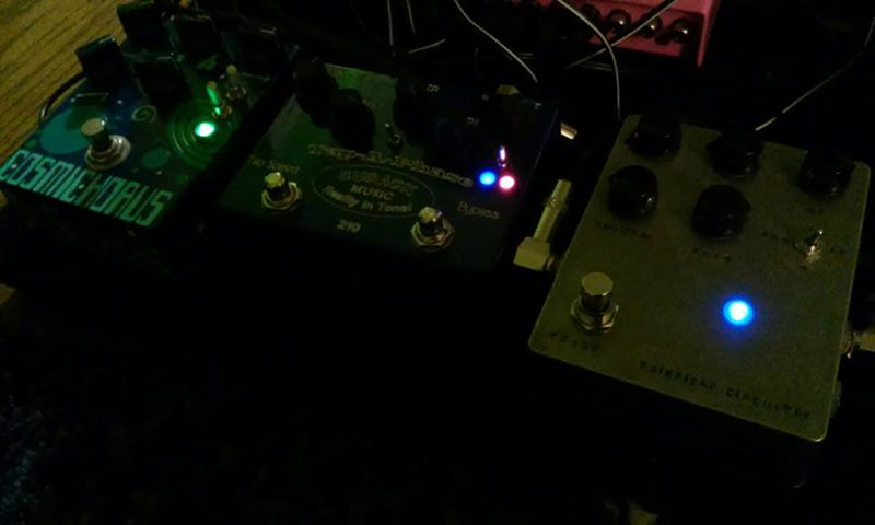 There's the Langtronics Bone Collector Envelope/Fuzz (love it especially with TGD). And the Dirge Electronics one knobber I've been rocking as the very last thing, usually boosted with something loud and fuzzy. There's still the Mom'd oscillating special fuzz (the Porche red) which is my Pink Floyd sounds going on a trip on a motorboat in a box. Yeah. Mr Black Eterna shimmer reverb which I find pretty cool not only with clean-ish bass sounds but with octave up fuzz too.