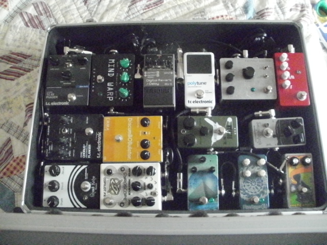 signal path: Mellowtone Hi 5->Algal Bloom->3-knob Great Wall->W&C Tall Font Russian->EQD Sound Shank->Montreal Assembly Goodbye 24->Fairfield Randy's Revenge v.1->Polytune->(patch out for volume pedal)->RV-3->Copilot Tap Gyroscope->EMMA DiscumBOBulator->Seppuku Mind Warp->TC Phaser XII->TC SCF chorus/flanger->EQD Ghost Echo