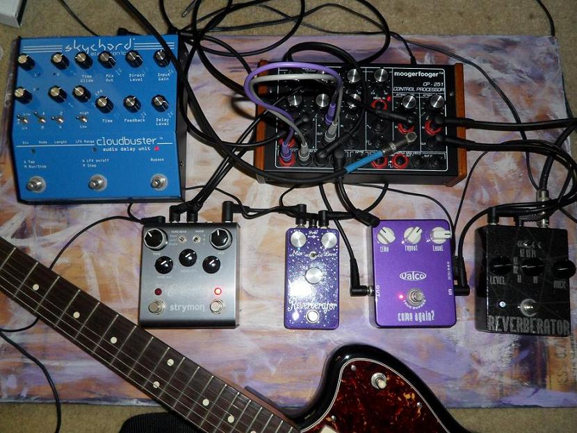 Meatball w/ fuzzrite and a/da flanger in f/x loop > Maestro Parametric Filter/OD > Maestro Fuzztain > Kay Fuzz Tone > Koma db101 gate/delay > fooger delay w/ chamber of tones analogue percussion synth in f/x loop > rams head > infinitphase mkII > gatekeeper mkII > space echo tape delay