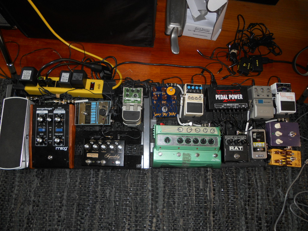 This was tonight's situation. The board is basically how it usually is, but I loaned my Keeley TR-2 out and it's a mainstay on the board. I have a custom pedal coming that I designed to allow me to pull whatever I have in the loop of the modified AD900, out and in front of the AD900 with the stomp of switch...and back. The Gyro sounds amazing through the AD900's loop, but I also like using it direct as well hence the need for a way to toggle it in and out of the loop.