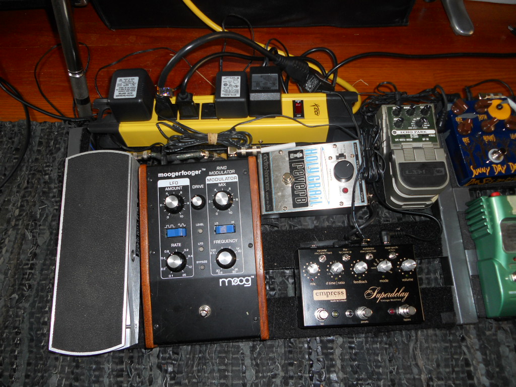 ...the blue pedal beneath the RRR is a Mojo Hand Ramp Unit which I use to control the Gyro and Luna (and 770 when it's on the board). Underneath the board, in the "trunk", is a Burkey Flatliner PRO and vintage MXR Power Converter as well as some more pedals that I keep powered, just out of the way.