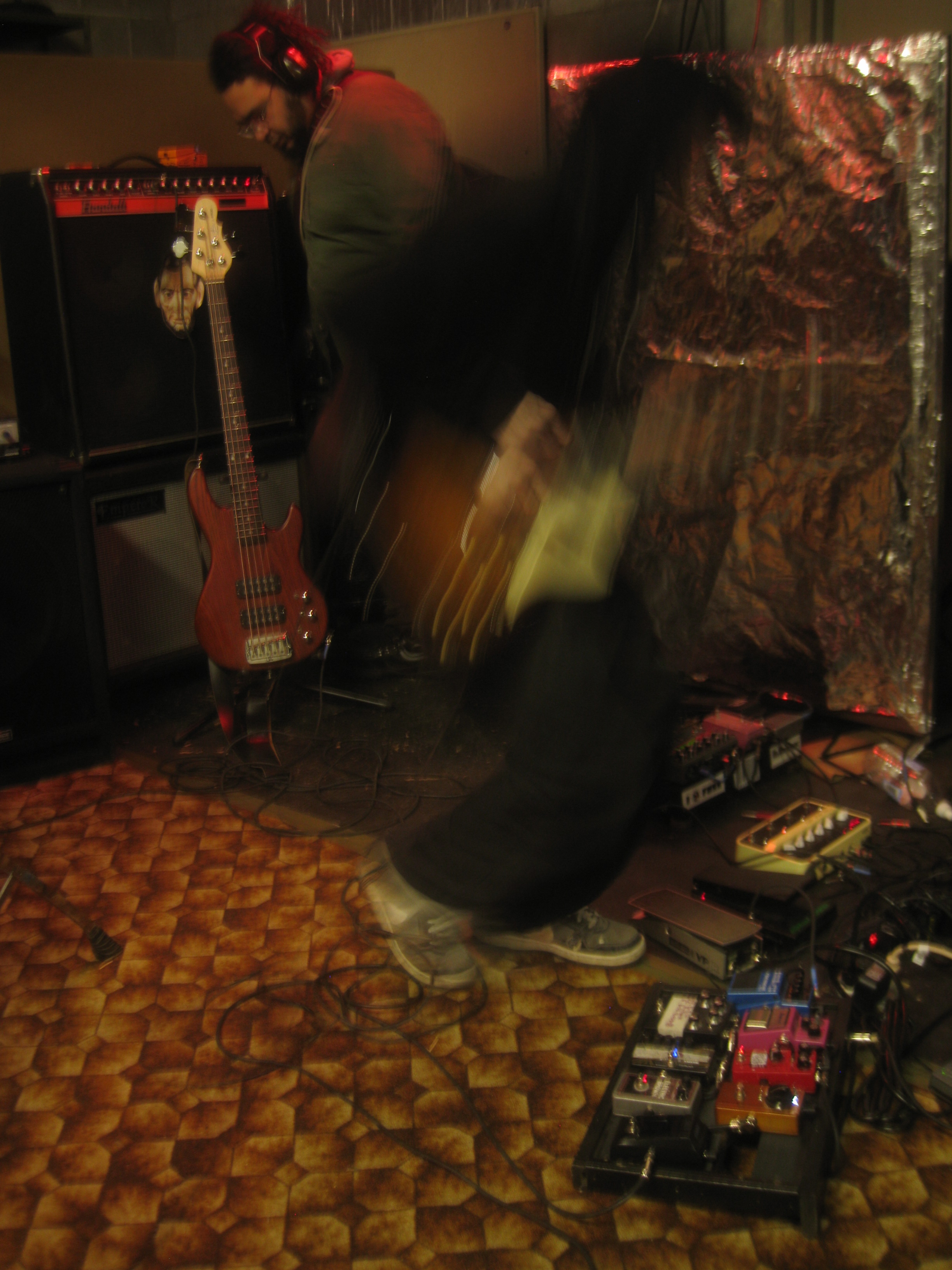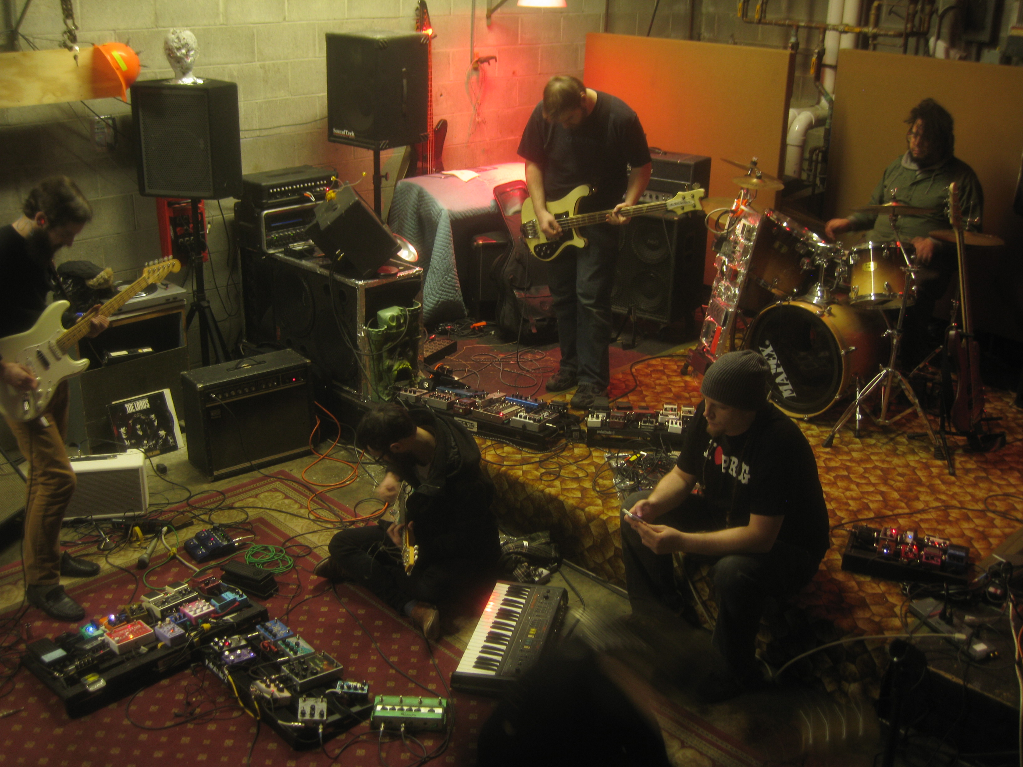 Holy crap, that was so much fun! Yeah, I took a crapton of photos... and then left my camera in BigChief's car. Arg! There was audio - AndTheLiquidmen had a Zoom recorder going, and Ryan/Matt recorded on an iPad. I called Matt Ryan all night long, only realizing now that Internet names are not real. Everyone was super nice... things went really organically from just talking/snacking to pedal-gazing to jamming out. I think that everyone had at least one point in the night where they made sounds that made everyone else go WHOA! Matt and John were amazing hosts. Brian SS/bs brought his keyboard, but played a random Godin electric we found at the space instead. Kbithecrowing made soundscapey noises with Eau Claire Thunder feedback and modulation better than anyone I've heard yet. Behndy talks just like I thought he would, only an octave lower than I had assumed. Everyone was REALLY REALLY nice. I had an awesome time messing with the 2525 that Behndy brought, and am really looking forward to messing with my new 4545. There's more, but I have to go butter some toast.