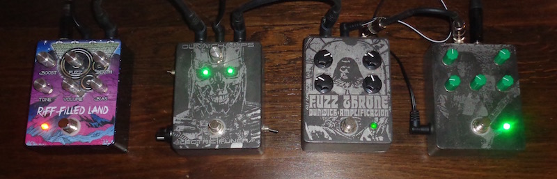 On the left, my combination DIRGE Shin-ei Companion Fuzz + Tap Tempo Tremolo, which is pre-wedding era DIRGE. The Companion Fuzz has a switch that lifts the clipping diodes or something and makes it sound huge and bassy! I always think it sounds like Godzilla snoring.