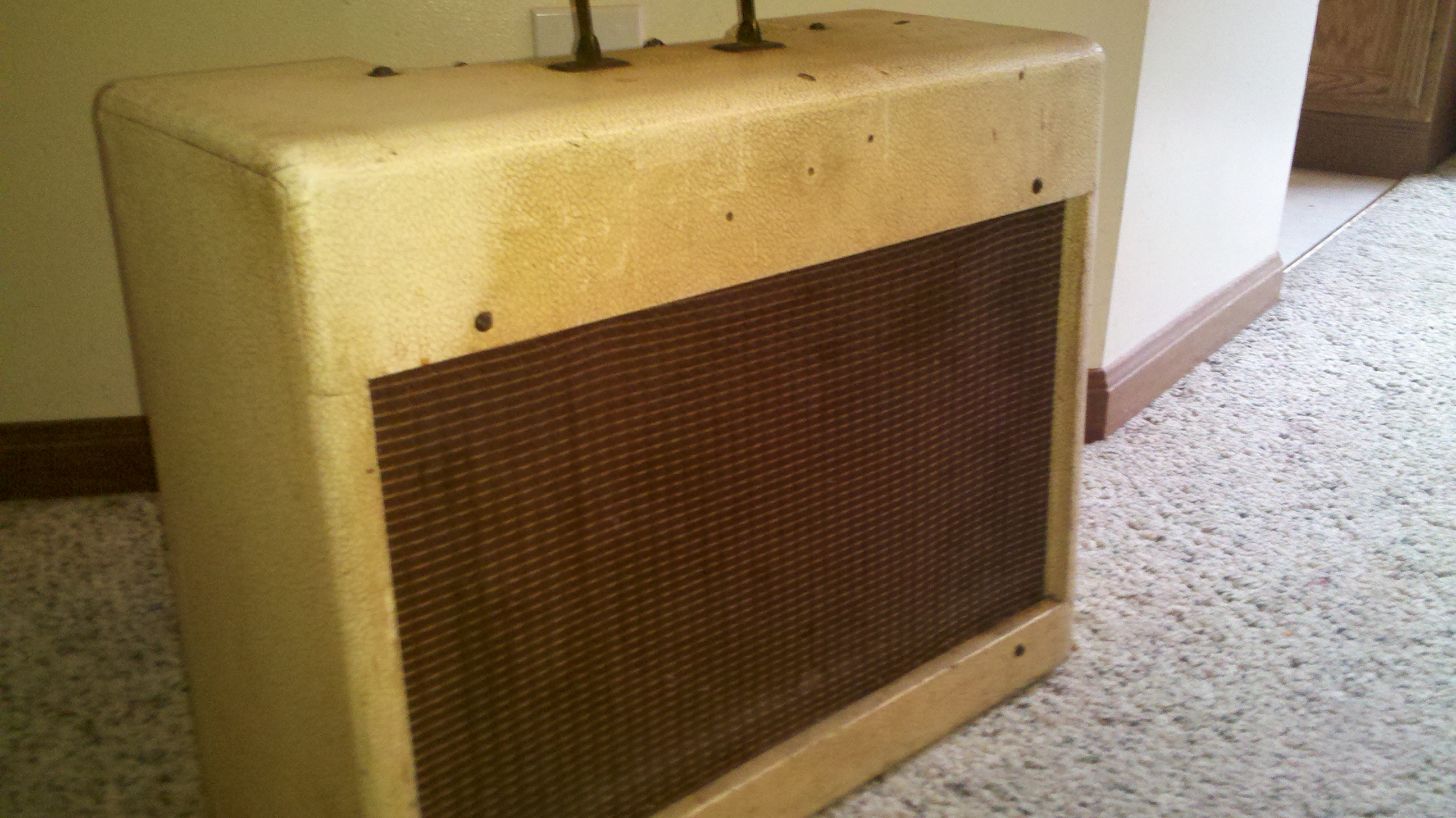 1959 Gibsonette. Replaced a couple cracked resistors and capacitors, and it's roaring now. Pretty quiet 8-10 watts. Very little headroom. Want loud sparkling cleans? Look elsewhere. Want great tube crunch at reasonable volumes? Get it right here. 12AX7 Pre, 2 6V6 power tubes, and a 5Y3 rectifier. Controls consist of an on/off switch and a volume knob; simplicity itself.Let's see your AMP!