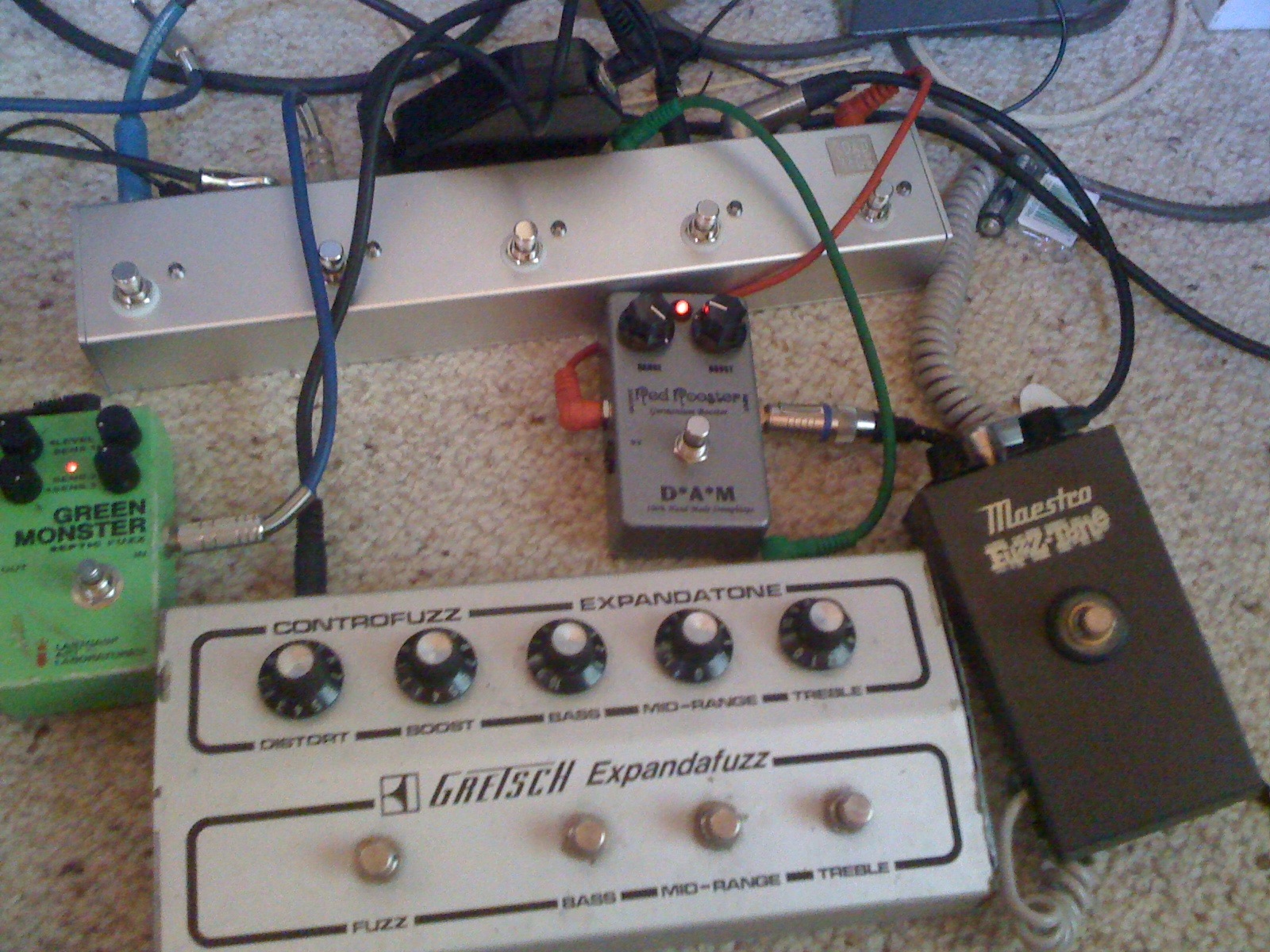 A setup I've used this morning to record a really trashy 60's garage punk track. The black pedal plugged directly into the looper is a Sunn Buzz. I also used a Verellen Big Spider on the bass track...