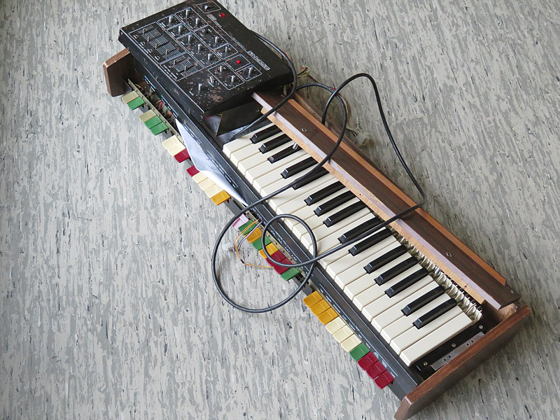 Now I just picked up its older brother, an SH-1000 (the first Roland instrument!) in terrible shape that is said to be defective (it powered on, but didn't produce sound, the seller said). All the potentiometer knobs are missing, as well as one of those paddle switch knobs. The black metal case with the controls has rusted. And I hope that no important parts are missing (most of the screws are, though).