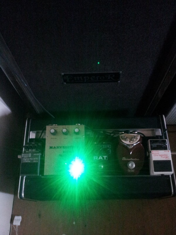 My beat up old marveltone got a makeover as well, new jacks, true bypass, clean pots, 9v jack and filled the hole the prior owner drilled in the enclosure with a green led. It screams "tone" for sure, but do any of you diy'ers have any suggestions on dimming that fucker down? It's like stairing into the vagina of another universe, it literally blinds me when I go to engage my stomps.