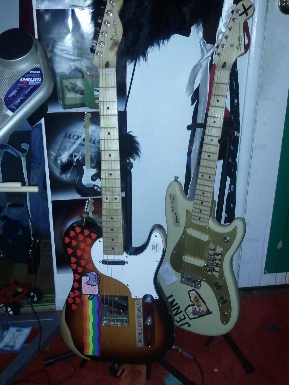 My main workhorses. The gold one is a Squier classic vibe duo sonic, stock hardware. Fell in love with it at my local guitar center, bought it as a backup/secondary guitar for studio and live use. Has a cleaner tone than the other Tele. The Tele has a bit of a story to it: I at one time had this epic strat that was my #1 guitar, but when I gave it to a buddy of mine to fix up, it somehow got let in a trunk and got warped beyond recovery. all I have left are the electronics, so hopefully one day I can have that installed in a new guitar body and have my strat back Frankenstein style. The reason I didn't strangle the guy is he gave me the Tele as collateral. Its a custom job he had been working on for a while and had recently completed, it has seymour duncan classic styled tele pickups, and was relic'd by the guy. standard tuners. not sure what the body is exactly but from the weight id guess Alder, but I could be wrong. It plays like an absolute dream, does all the things my strat could do and more with a much punchier sound. Also worth noting that when the pickup selector switch is flipped all the way towards the neck, it does something in the wiring that changes the phase (?) and makes the pickups sound like humbuckers, with all the added gain. Nice little mod the guy did. That Tele is definately my go to for most everything. :ewok: