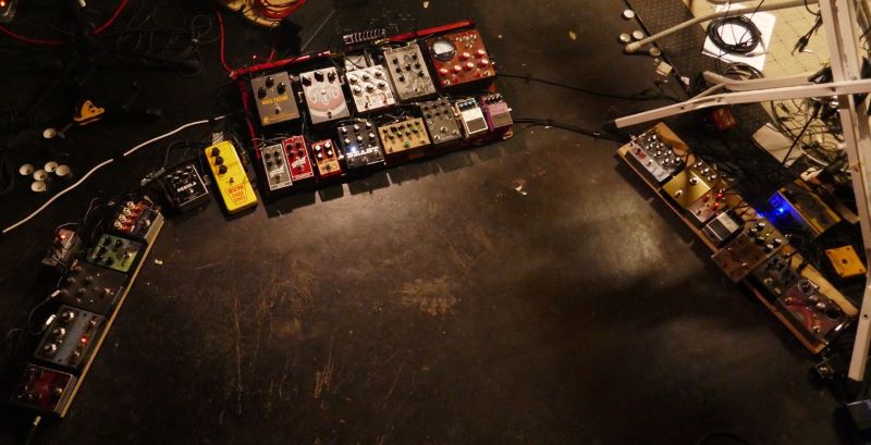 //2 -> EQD Tone Job -> OBNE Haunt Fuzz -> EQD Tone Reaper Fuzz -> EHX Pitch Fork -> Strymon El Capistan - EQD Avalanche Run.