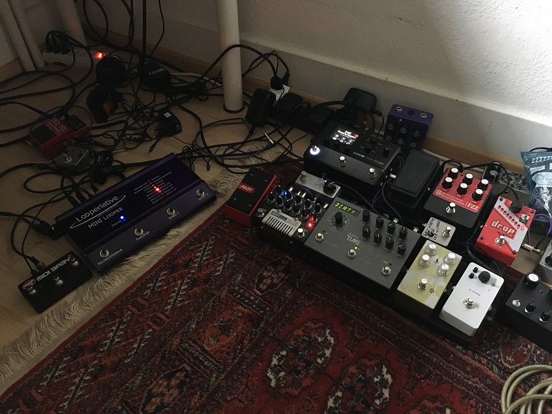 latest revision. i hadn't had the big board out in ages and it needed some rejiggering. i sold the LAL 46 because it was too OTT for what i do, and took the Tone Bender MKII clone off because i needed the space and it's my least favorite of the remaining distortion/fuzz boxes on the board.