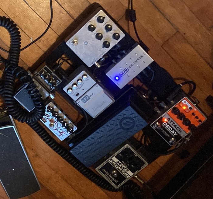Guitar and bass go through all the pedals on the floor and on the top shelf, then into one EDP and into a guitar amp. The Digitakt goes into the second EDP and into some monitors. The two EDPs are controlled by the FCB1010 and are synced together. Sometimes Digitakt is slaved to EDP 2 which is kind of cool- the EDP determines the BPM and the digitakt follows along, so I can noodle and then sync a drum track to it regardless of what BPM I recorded the loop at. There is one big issue though, which requires a MIDI multiplier/divider to sort, and I’m not going down that road right now, so it’s not midi synced currently. I just finger drum shit into the EDP, which is using like 0.1% of the Digitakt’s capabilities, but whatever!