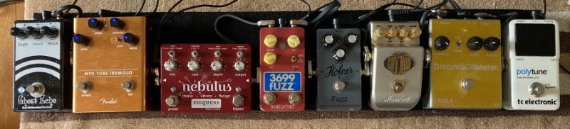 TC Electronics Polytune v1->EMMA Discumbobulator v1 envelope filter->Marshall Guv'nor Plus OD->Höfner Fuzz->Danelectro 3699 Fuzz->Empress Nebulus multi-modulation->Fender MTG Tube Tremolo->EQD Ghost Echo v2 reverb.
