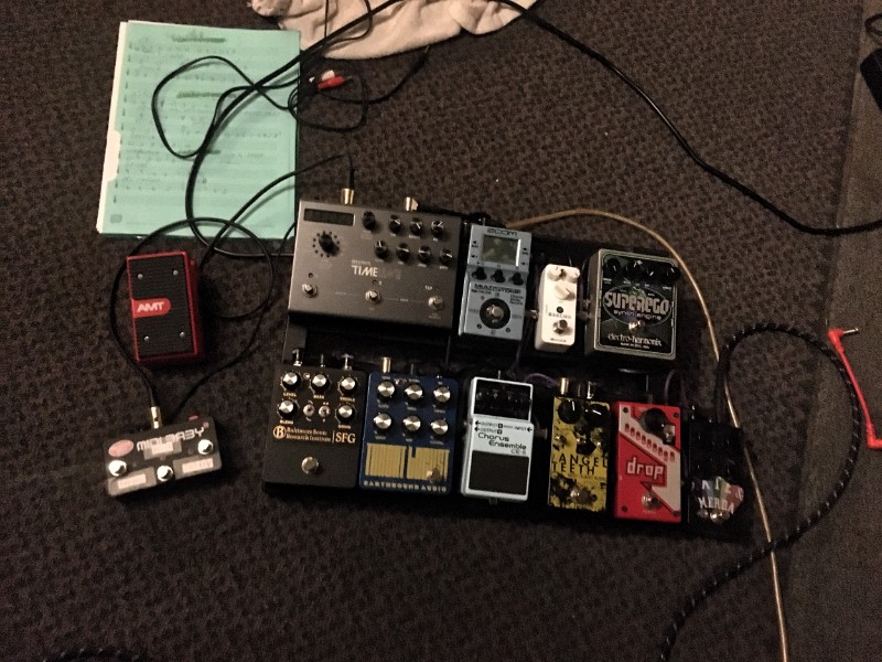 Chain is: Boss HM2 DIY Clone (offboard) > Drop > Superego > Mooer Reecho (it's an amazing mini delay pedal!) > Angel Teeth > Boss CE5 > Throat Locust > BSRI SFG > MS70CDR > Timeline (with an AMT expression pedal and a Midibaby 3 to control the TL looper)