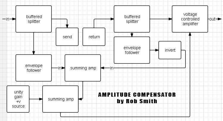 P.S. the amplitude compensator and the fuzz gate are two different pedals. they do not work the same BUT you can put them both in the same box and have a switch. the circuits are very similar. the follower on the input can be used for both, as well as the output VCA. the gate is a lot simpler than the compensator. since they both have the same number in/outs knobs. for knobs, you can do it with NO KNOBS but you may have to add a balance knob so the two envelope followers have unison amplitude before the clipping point of the pedal in the loop. volume knob optional. fuzz gate might want a threshold control for the input control voltage to bring the noise floor down to absolute zero. and make the send output impedance 10k so it emulates the average guitar pickup going into a fuzz.