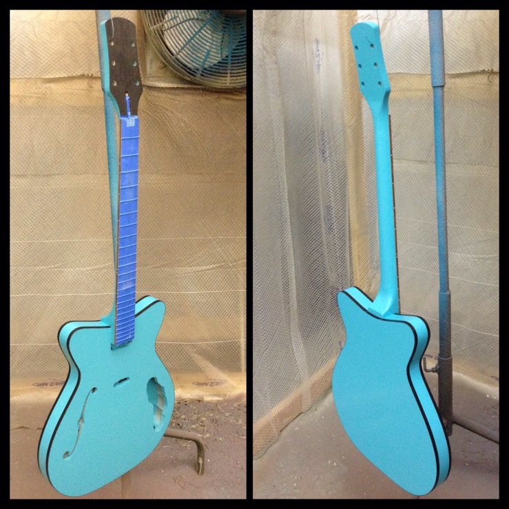 Here is a special order lefty Socialite. As you can see he wanted baby blue, maple fingerboard, white headstock veneer. This will get a silver pickguard.