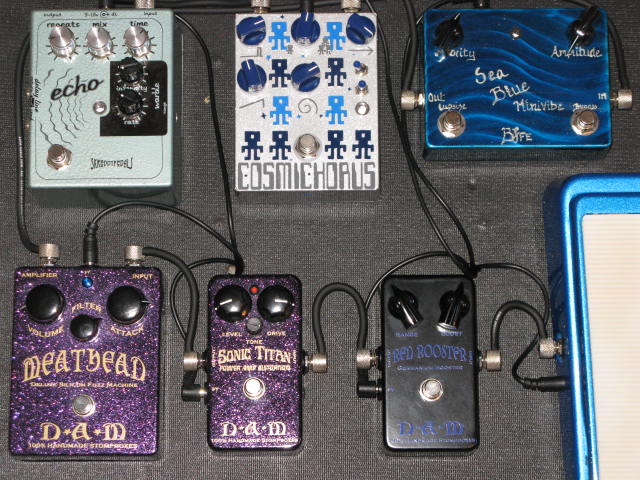 the empty space is for a tc electronics pedal tuner that's on the way. the black four-knobber is a zendrive clone i built still waiting to do graphics.
