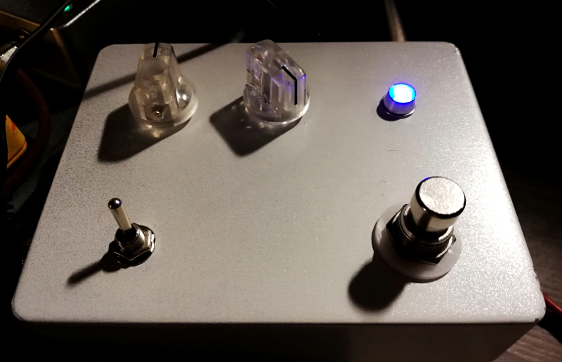 What I did then was put a Germanium Giant (https://tagboardeffects.blogspot.com/20 ... giant.html) in there, since I had it on the breadboard and it would utilize all the already drilled holes. Simple and very nice sounding, especially when pushed. Old MP38 transistor, 470nf caps, switch to select clipping between red LED/1N5817 and 1N34A/914 + 2.2 nf cap. Gotta swap out the power input, it's a bit unstable.