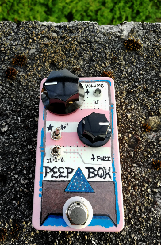This came about playing with the Basic Audio variant of the Pep Box on breadboard and listening to Lil Peep. Some resistor and cap adjustments, also put in two toggles in place of the tone pot; top is two-way bass boost (left)/cut (right), under that is a three-way mids switch that's heavy/flat/thin. Would have been more versatile with a pot but I wanted to try this and also have just two (big) knobs.