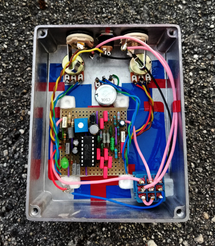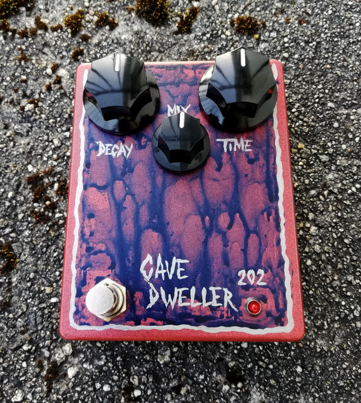 Here's a 2015 ed. Madbean Cave Dweller. Made the earlier version already, and while that's an alright delay i had to try the new one, and it does sound better. No tone suck due to the buffer, which is a J202. The long times past noon are still dirty af, but sometimes that's a nice thing. Has a bassless, airy sound that stays out of the way, and also coasts right on the edge of self-oscillation.